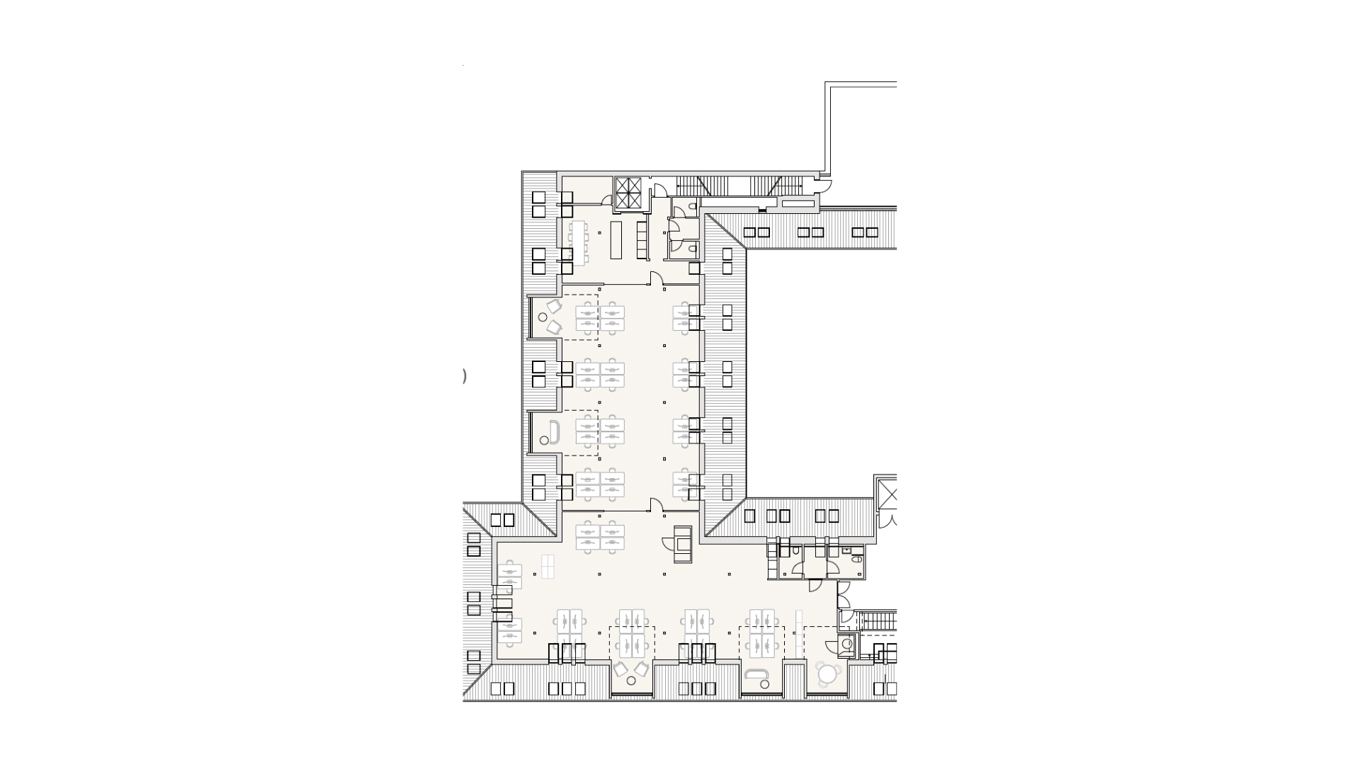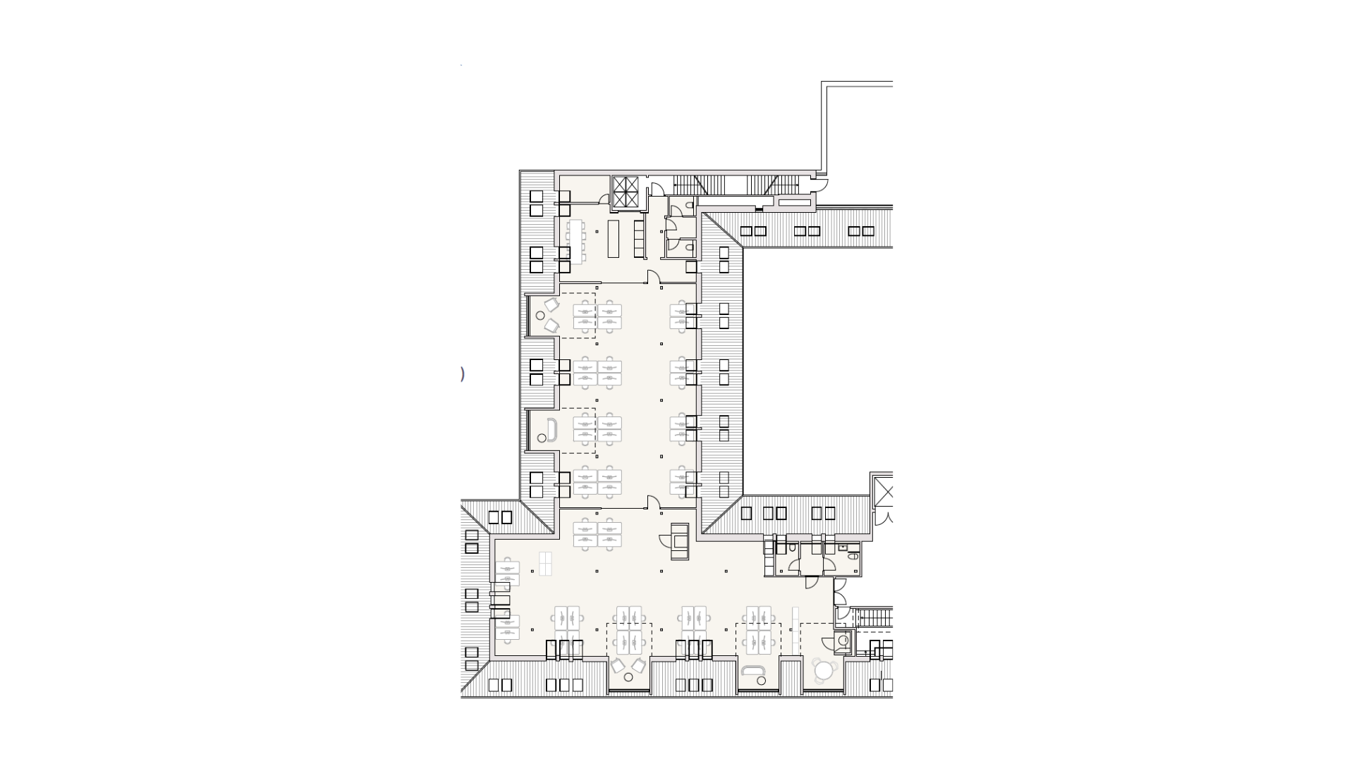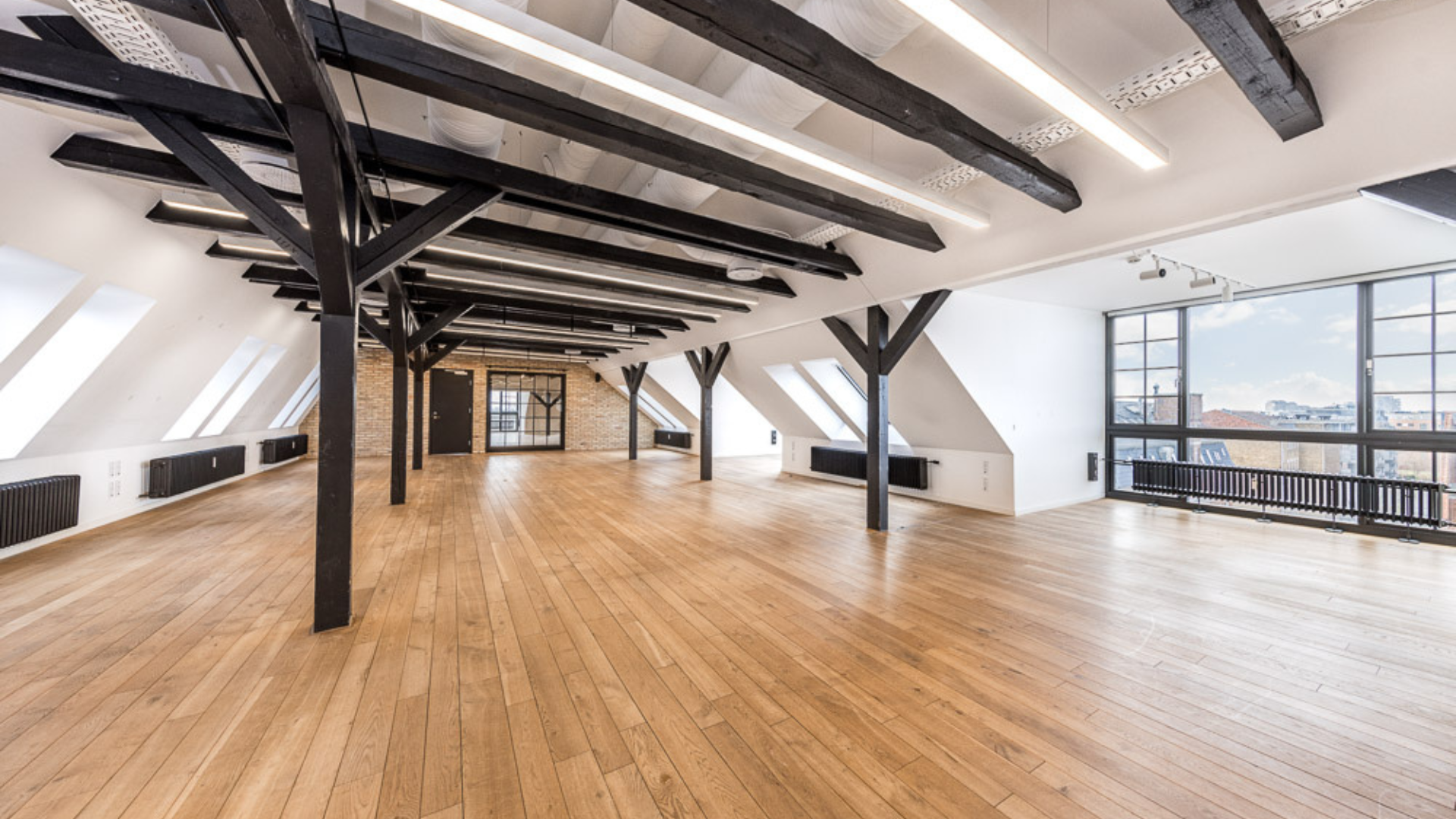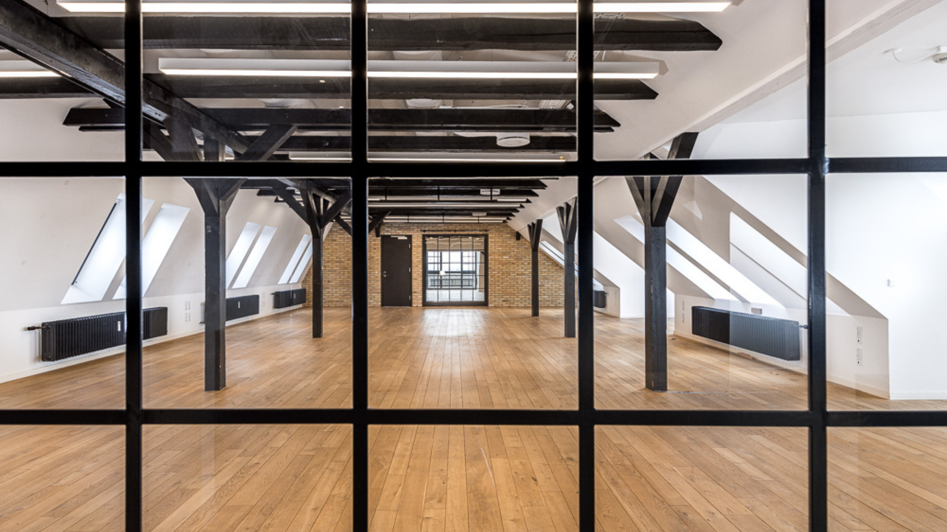På 5. salen finder finder I et stort og lyst lejemål på 557 m2 og med plads til 48 arbejdsstationer. Lejemålet har hvide vægge og lofter, lyst trægulv samt store New Yorker vinduer, der sikrer lejemålet et godt lysindfald.