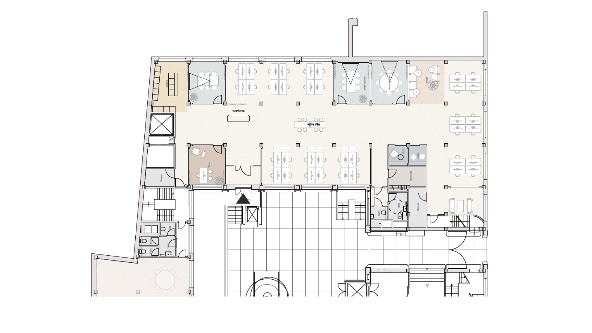 Med lounge og touch down spaces opnås en bredere pallette af arbejdsrammer, som understøtter et mere dynamisk arbejdsliv og forbedrer arealeffektiviteten.