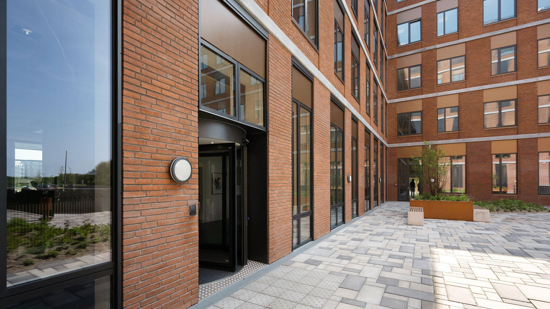 Stor parkeringsplads tæt på kontorhusets hovedindgang gør det nemt at finde en plads både til bilen og cyklen.