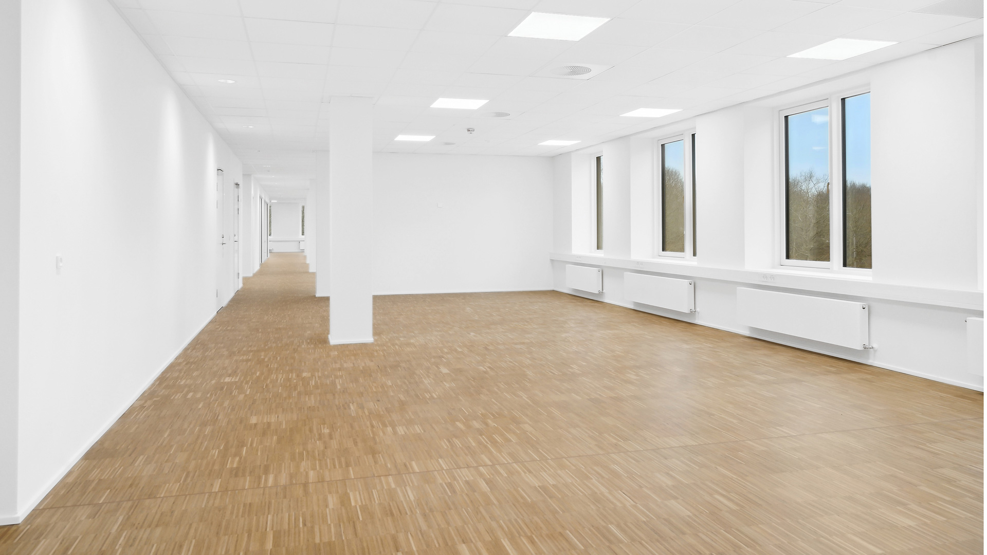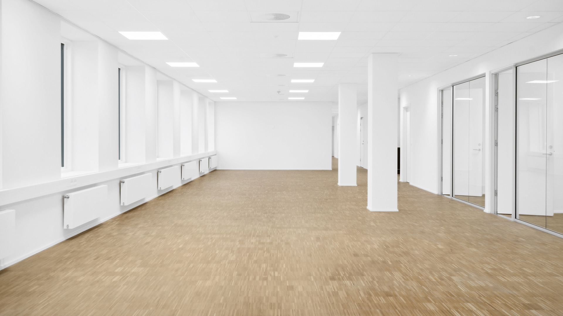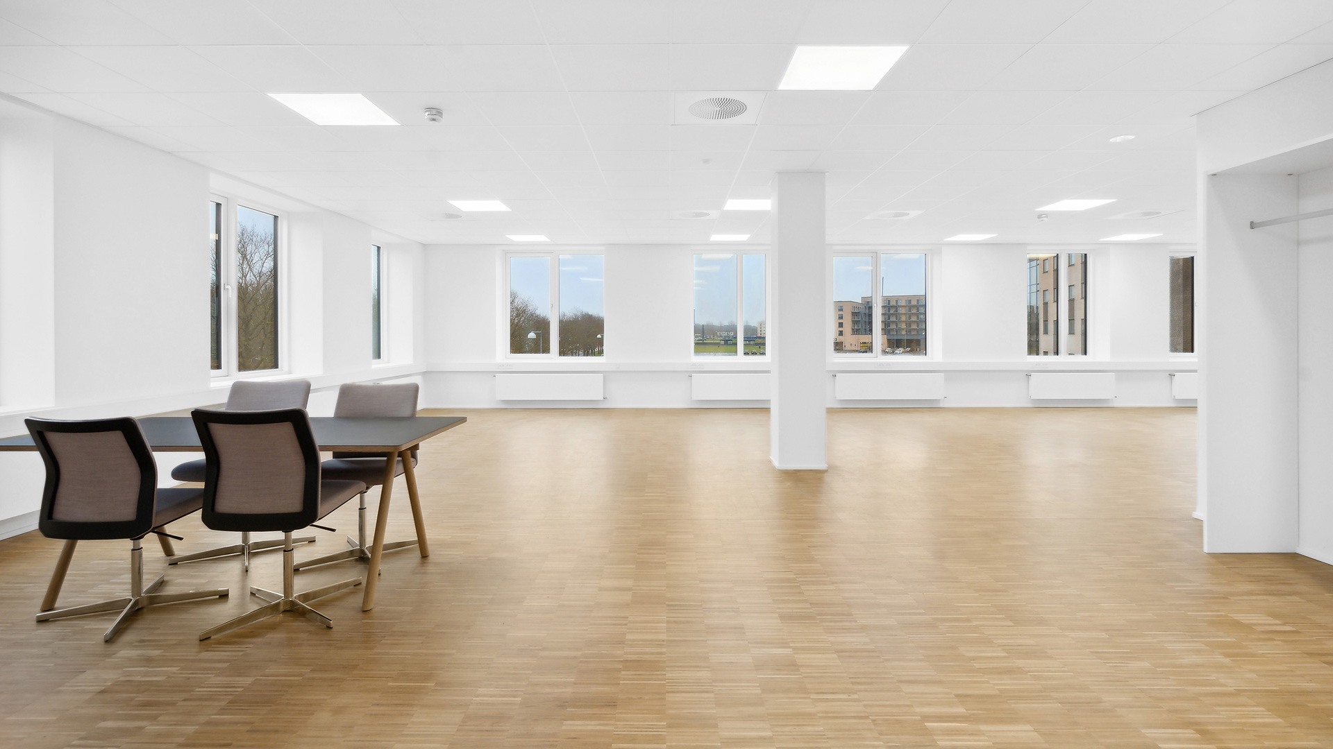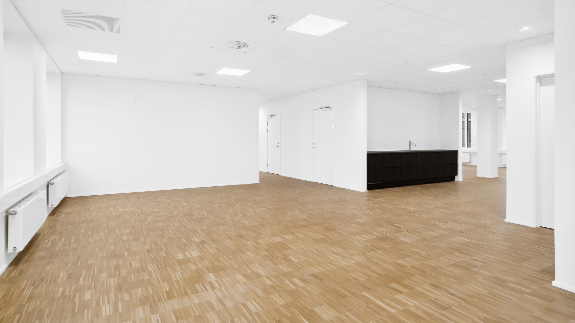 Fra et indbydende ankomstområde med fælles reception og mødecenter kan du tage trappen eller elevatoren op til kontorhusets 1. sal. Her finder du et stort og lyst lejemål med hvidmalede vægge og lofter, store vinduer og lyst trægulv. Til lejemålet hører eget tekøkken, mødelokale samt toiletfaciliteter.