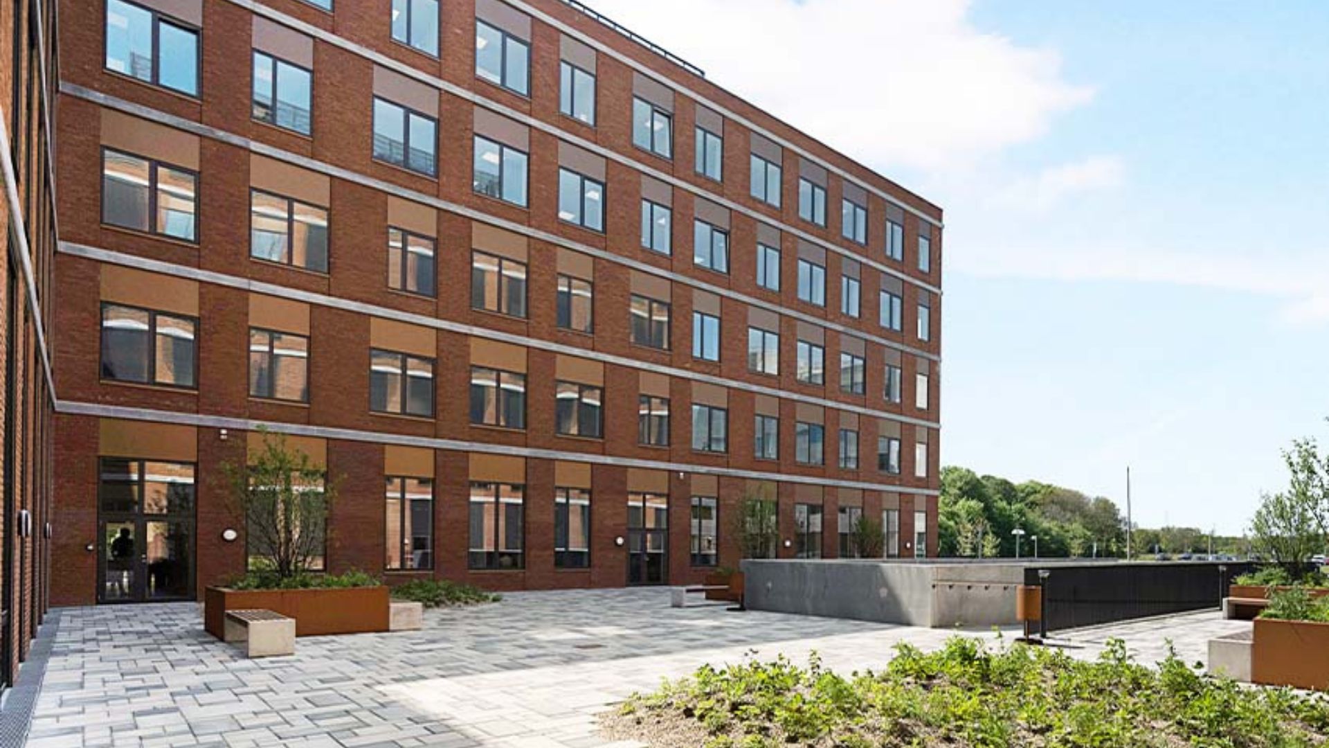 Stor parkeringsplads tæt på kontorhusets hovedindgang gør det nemt at finde en plads både til bilen og cyklen.