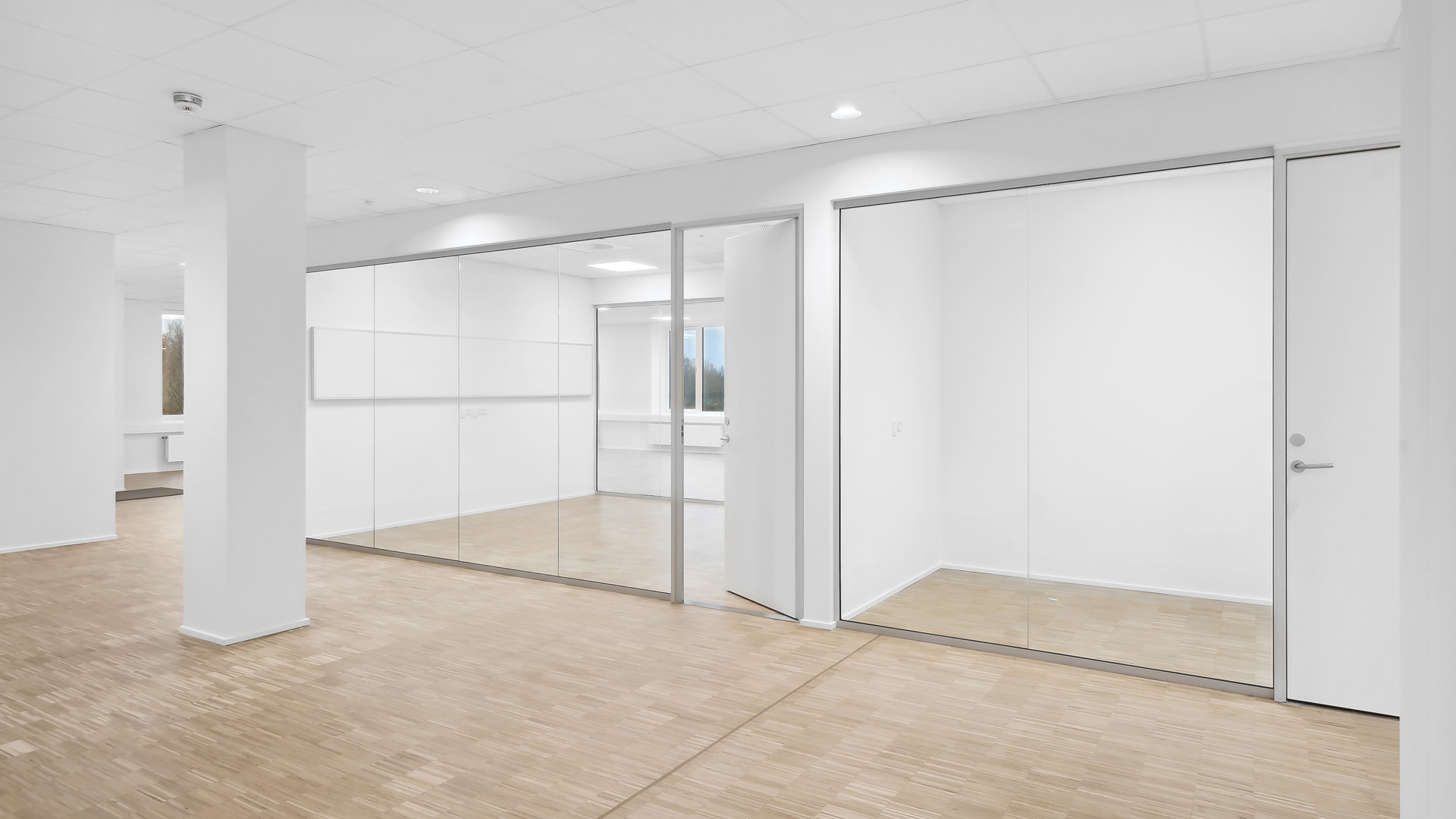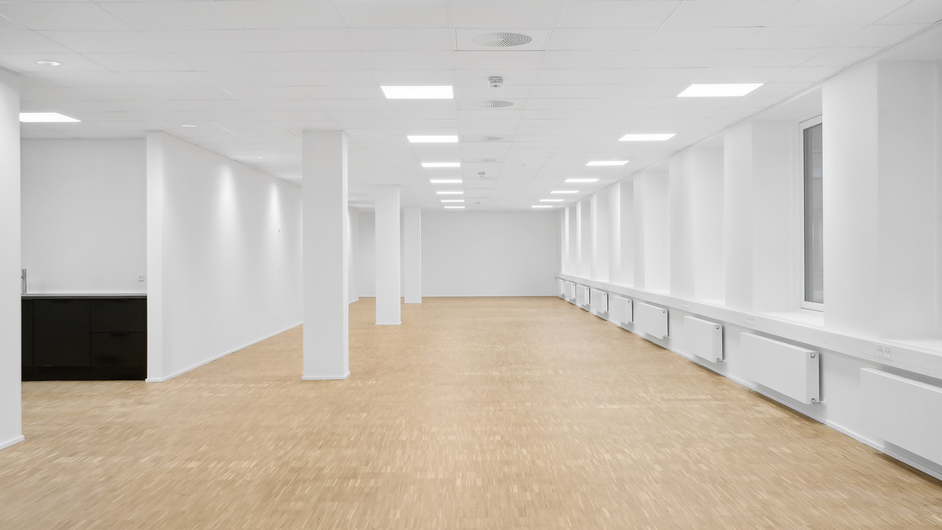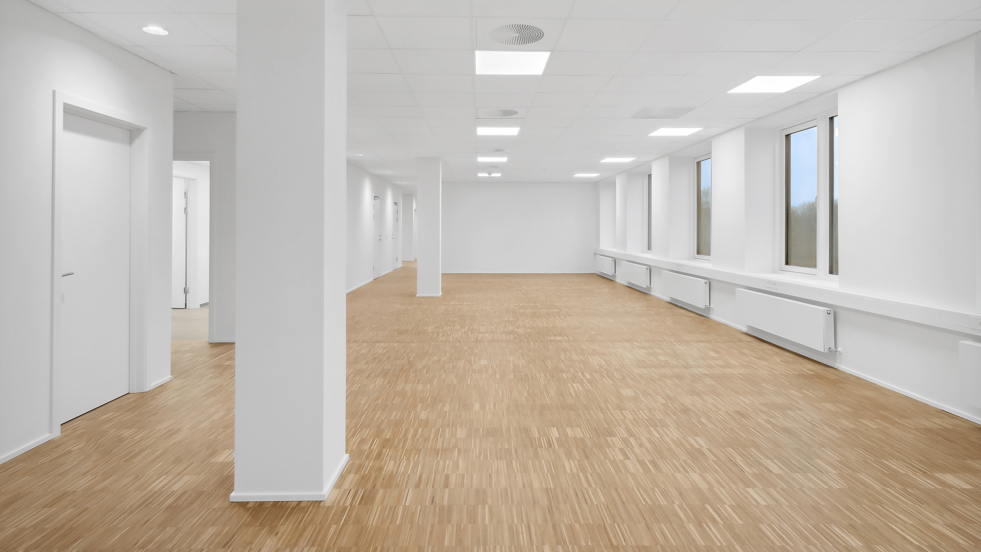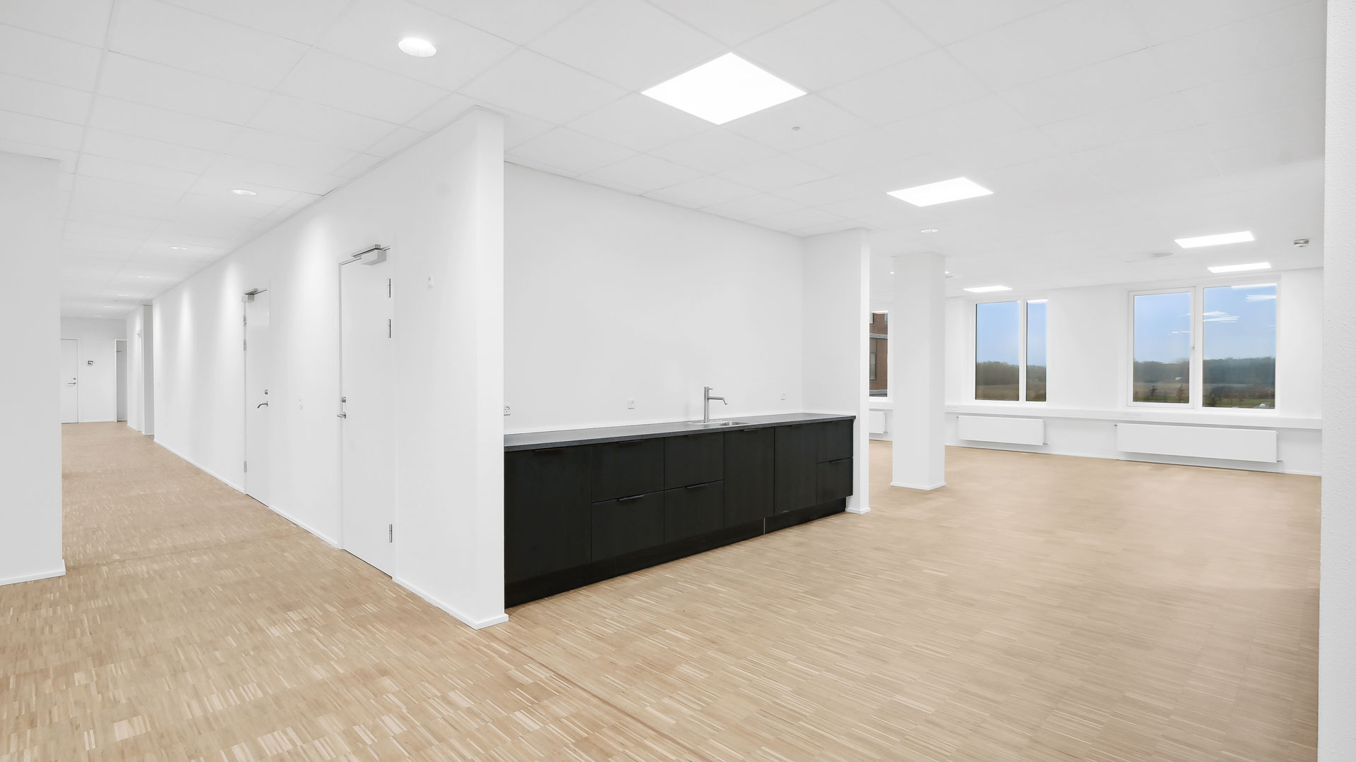 Fra et indbydende ankomstområde med fælles reception og mødecenter kan du tage trappen eller elevatoren op til kontorhusets 3. sal. Her finder du et stort og lyst lejemål med hvidmalede vægge og lofter, store vinduer og lyst trægulv. Til lejemålet hører eget tekøkken, mødelokale samt toiletfaciliteter.