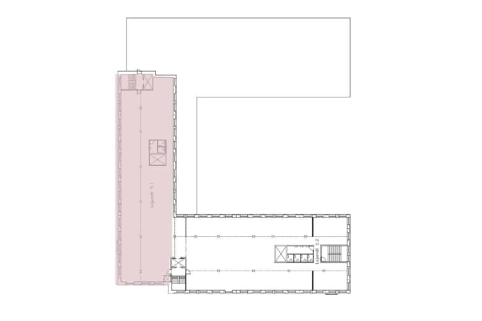 Fra et indbydende ankomstområde med fælles reception og mødecenter kan du tage trappen eller elevatoren op til kontorhusets 5. sal. Her finder du et stort og lyst lejemål med hvidmalede vægge og lofter, store vinduer og lyst trægulv. Til lejemålet hører eget tekøkken, mødelokale samt toiletfaciliteter.