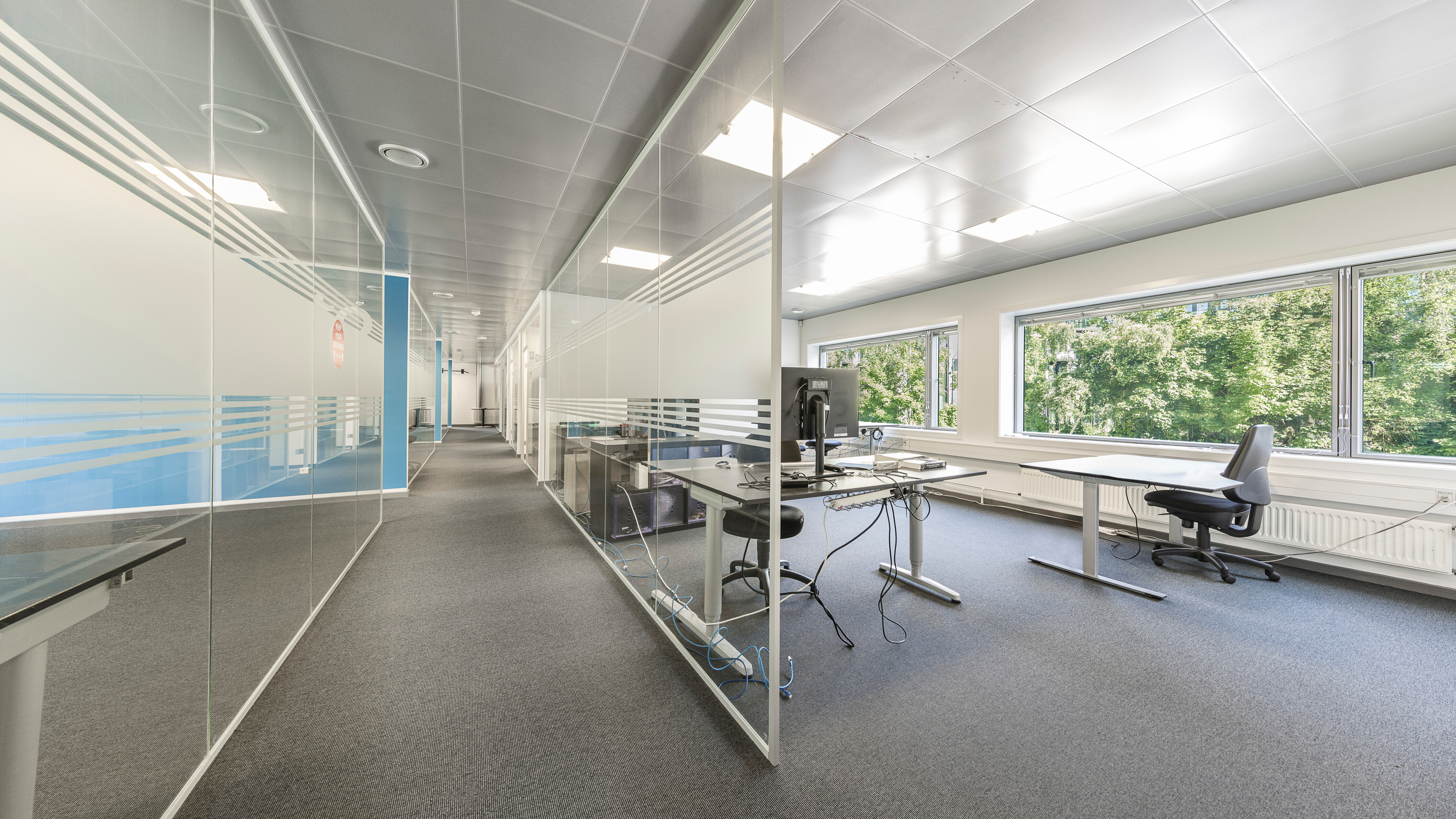 Fra ankomstområdet kan du tage trappen eller elevatoren op på husets 1. sal, hvor I finder et stort og lyst kontor. Kontoret har hvidmalede vægge, store vinduer samt skillevægge lavet i glas. Kontoret er 455 m2 stort (inkl. andel af fælles kantine, mødecenter og adgangsveje), og har udover ejendommes attraktive fællesfaciliteter adgang til eget tekøkken.