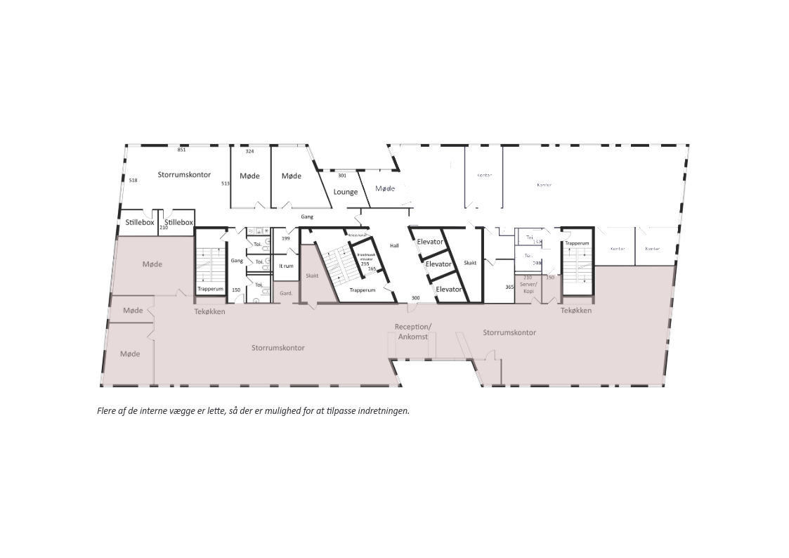 Her er ideelle rammer for en moderne arbejdsplads med mulighed for reception, klassiske kontorarbejdspladser, projektzoner og attraktive fællesområder. Lejemålet indeholder desuden tekøkken, toiletter og mødelokaler.