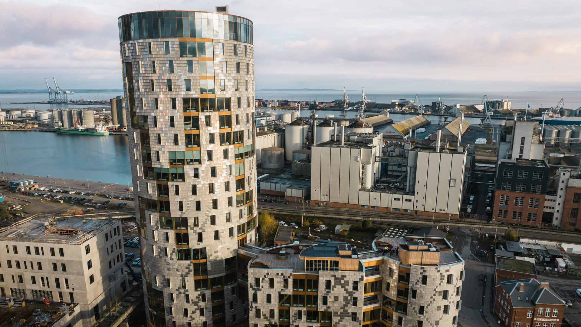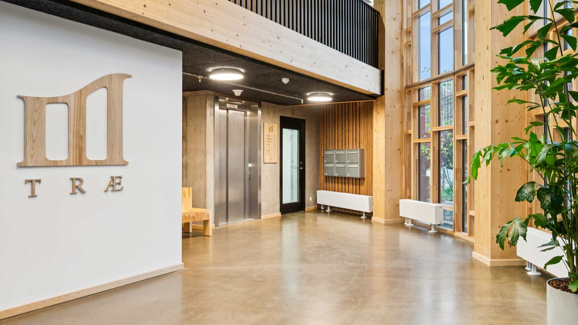 TRÆ er landets højeste træhus med sine 78 meter og 20 etager. Udover træ er TRÆ bygget i beton og glas, og mange af materialerne er genbrugte eller upcyclede – for eksempel kasserede vindmøllevinger, der bliver brugt på facaden og 2.000 gamle armaturer fra Netto-butikker, som med en makeover har fået nyt liv i TRÆ.