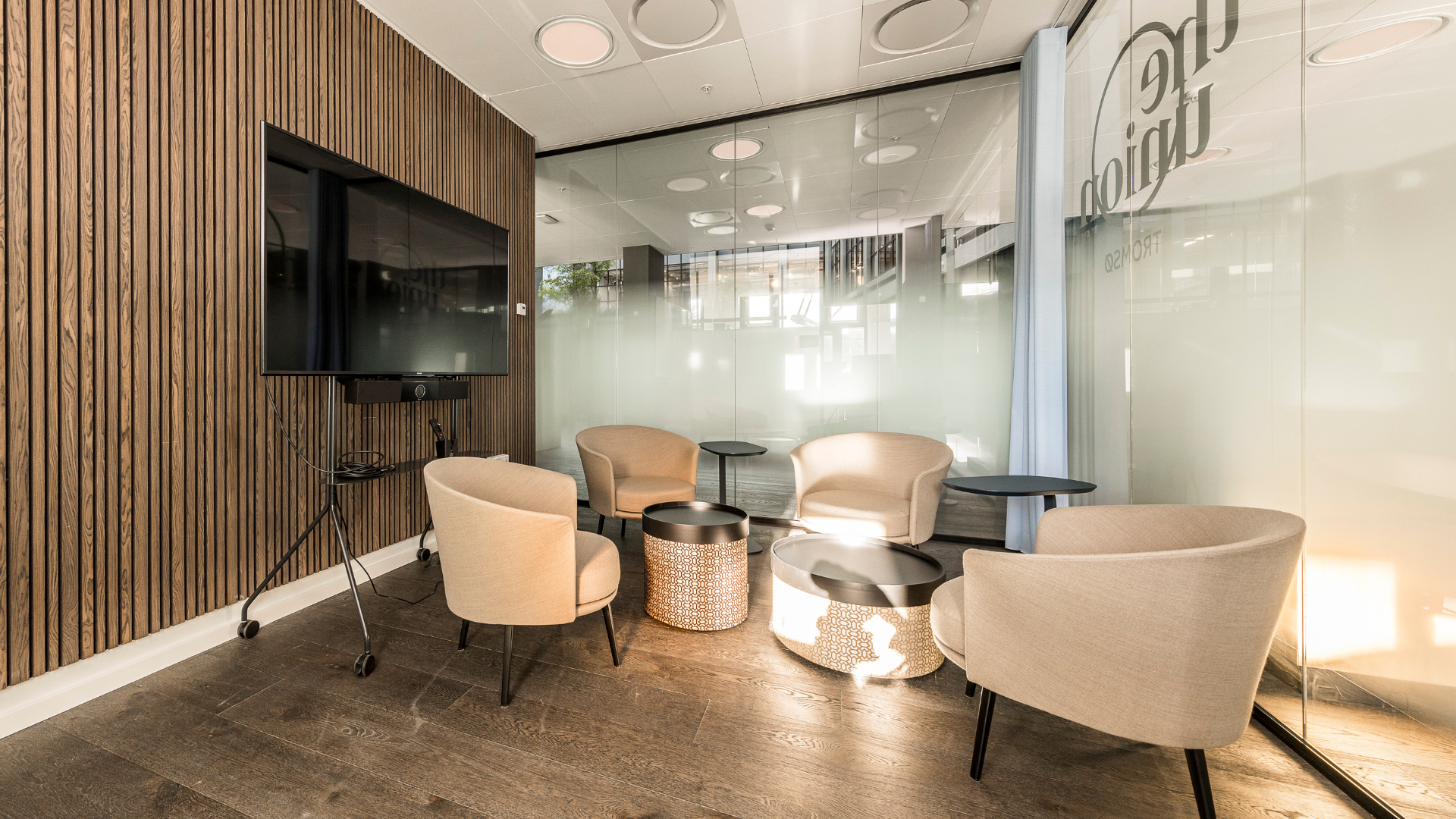 En indbydende lobby tager godt imod dine gæster, som kan melde deres ankomst digitalt.