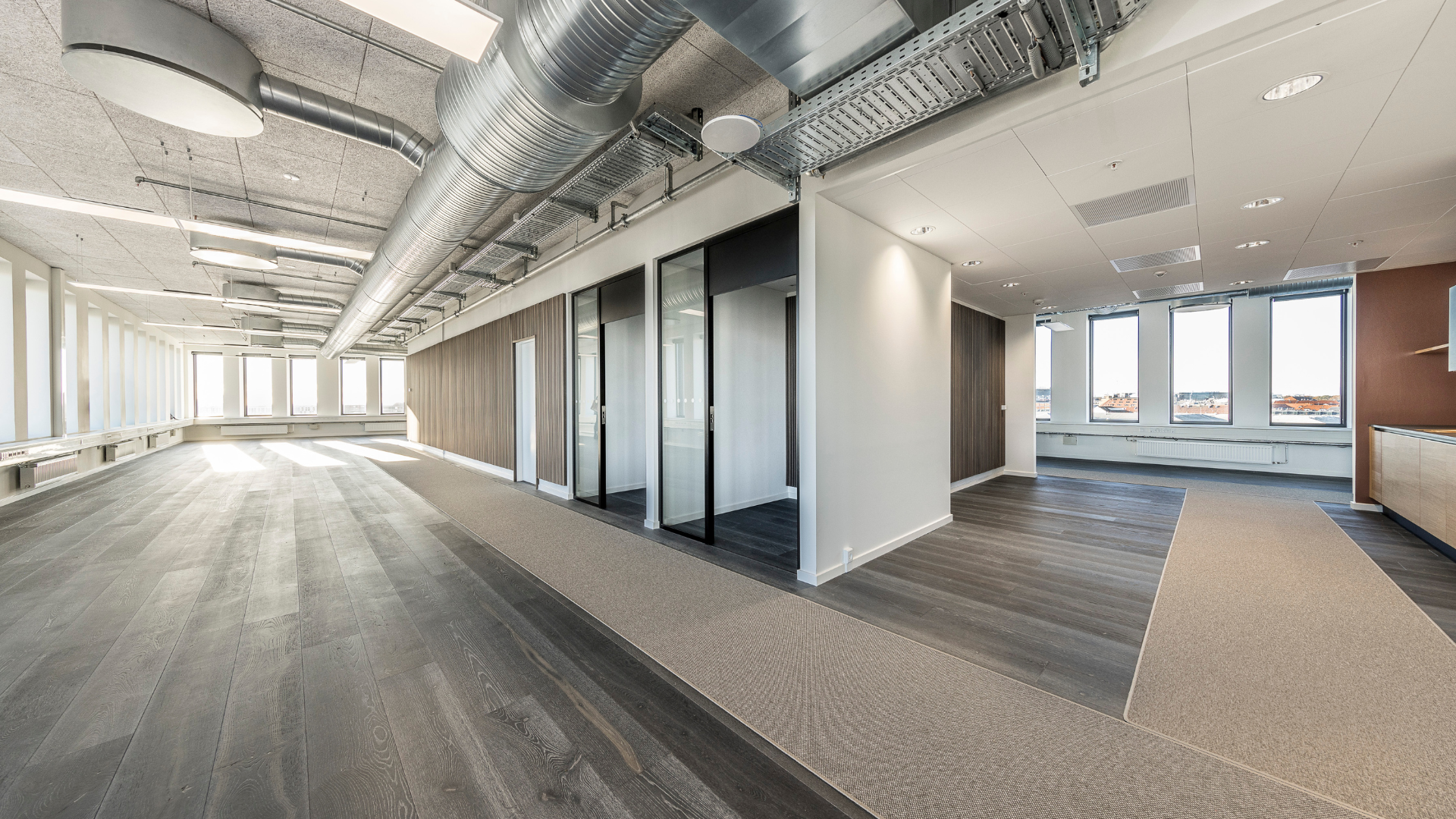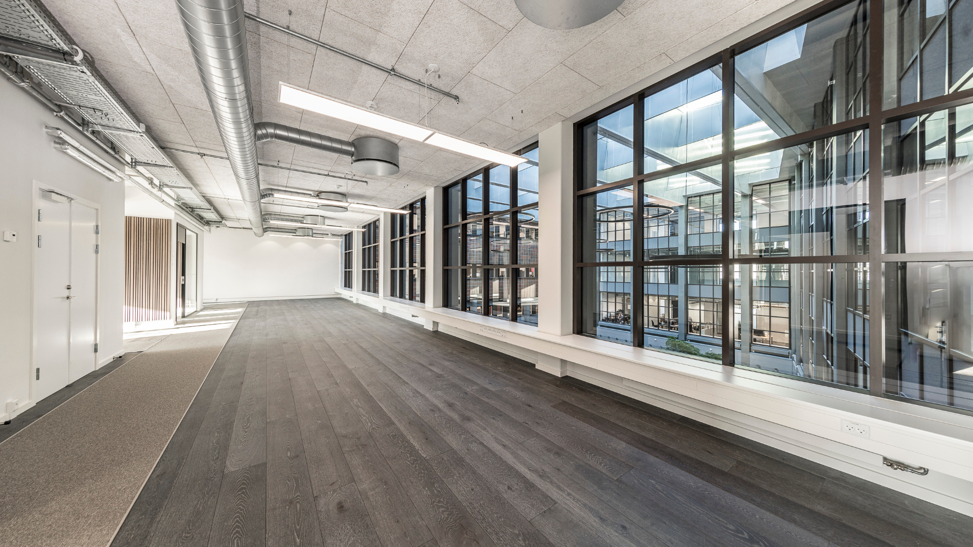 Fra lobbyen kan I tage trappen eller elevatoren op på kontorhusets 3. sal, hvor I finder et stort og lyst lejemål med plads til 52 arbejdspladser. Kontoret består af et stort kontorareal med et industrielt look og store vinduespartier, der skaber et lyst og åbent arbejdsmiljø. Til kontoret hører også eget te-køkken, møderum og toiletfaciliteter. Har I brug for parkering til cyklen eller bilen, er dette muligt ved området omkring kontorhuset.
