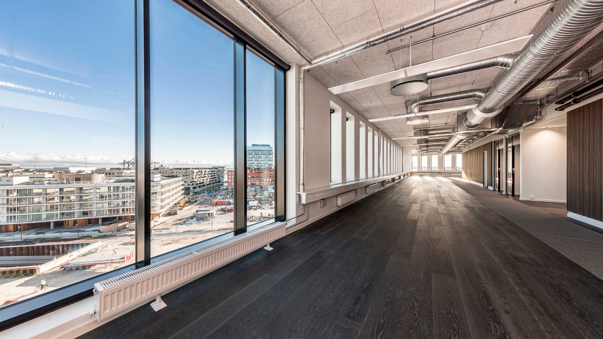 Fra lobbyen kan I tage trappen eller elevatoren op på kontorhusets 8. sal, hvor I finder et stort og lyst lejemål med plads til 48 arbejdspladser. Kontoret består af et stort kontorareal med et industrielt look og store vinduespartier, der skaber et lyst og åbent arbejdsmiljø. Til kontoret hører også eget te-køkken, møderum og toiletfaciliteter. Har I brug for parkering til cyklen eller bilen, er dette muligt ved området omkring kontorhuset.